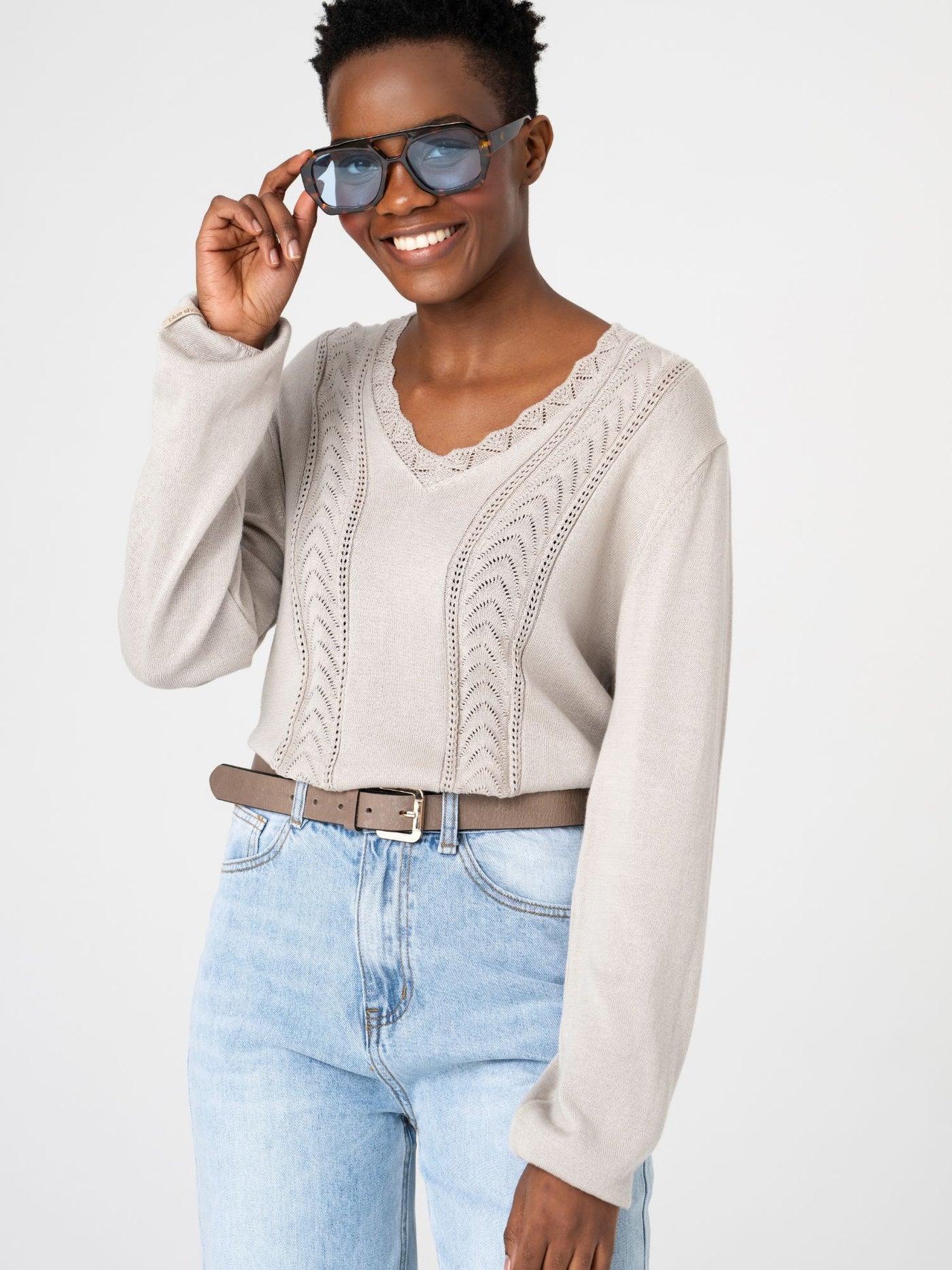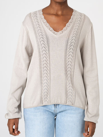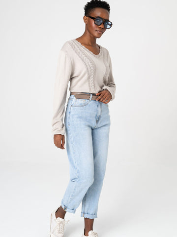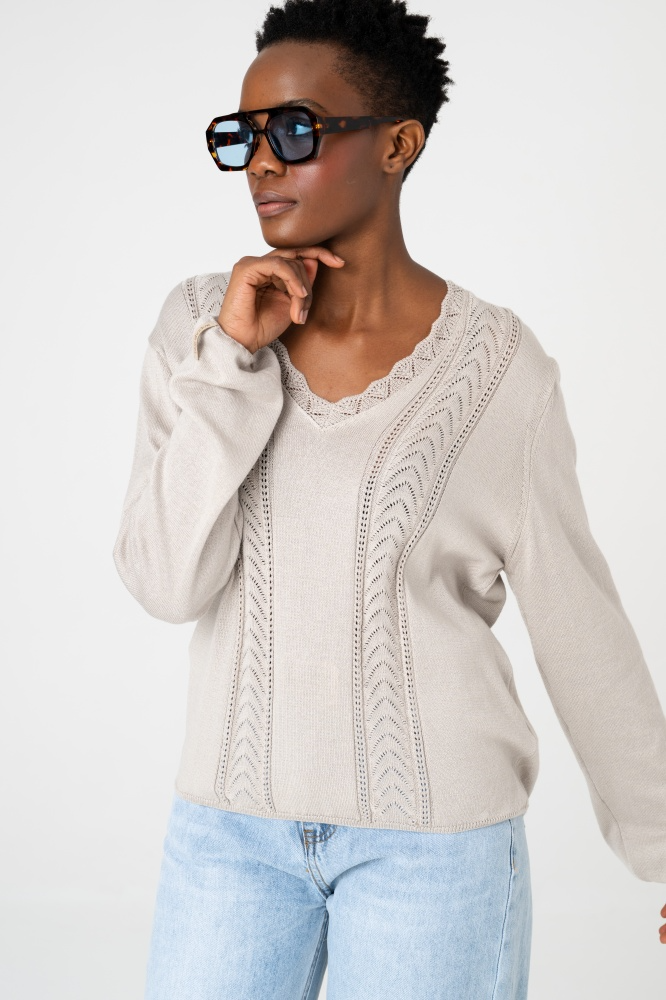 Klasikinė V formos iškirptė suteikia elegancijos ir vizualiai ilgina kaklo liniją, todėl megztukas atrodo lengvas ir moteriškas. Laisvesnis siluetas nevaržo judesių ir patogiai prisitaiko prie skirtingų figūrų.