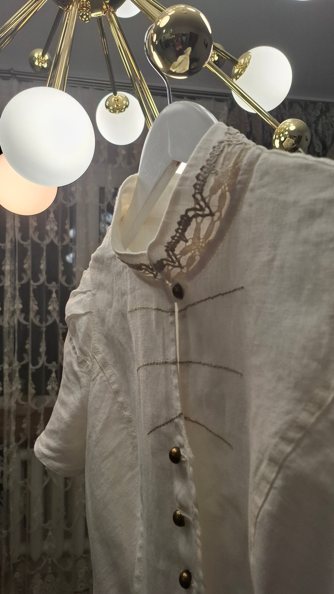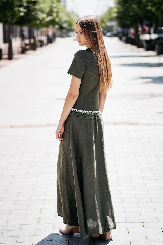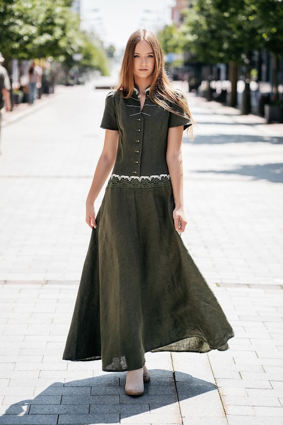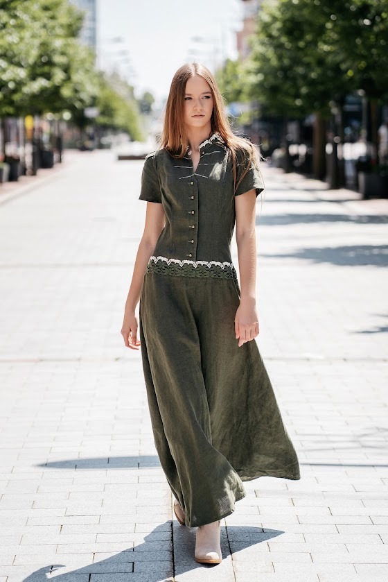 🌿 Ilga lininė suknelė su nėriniais (samaninė ir natūraliai balta)