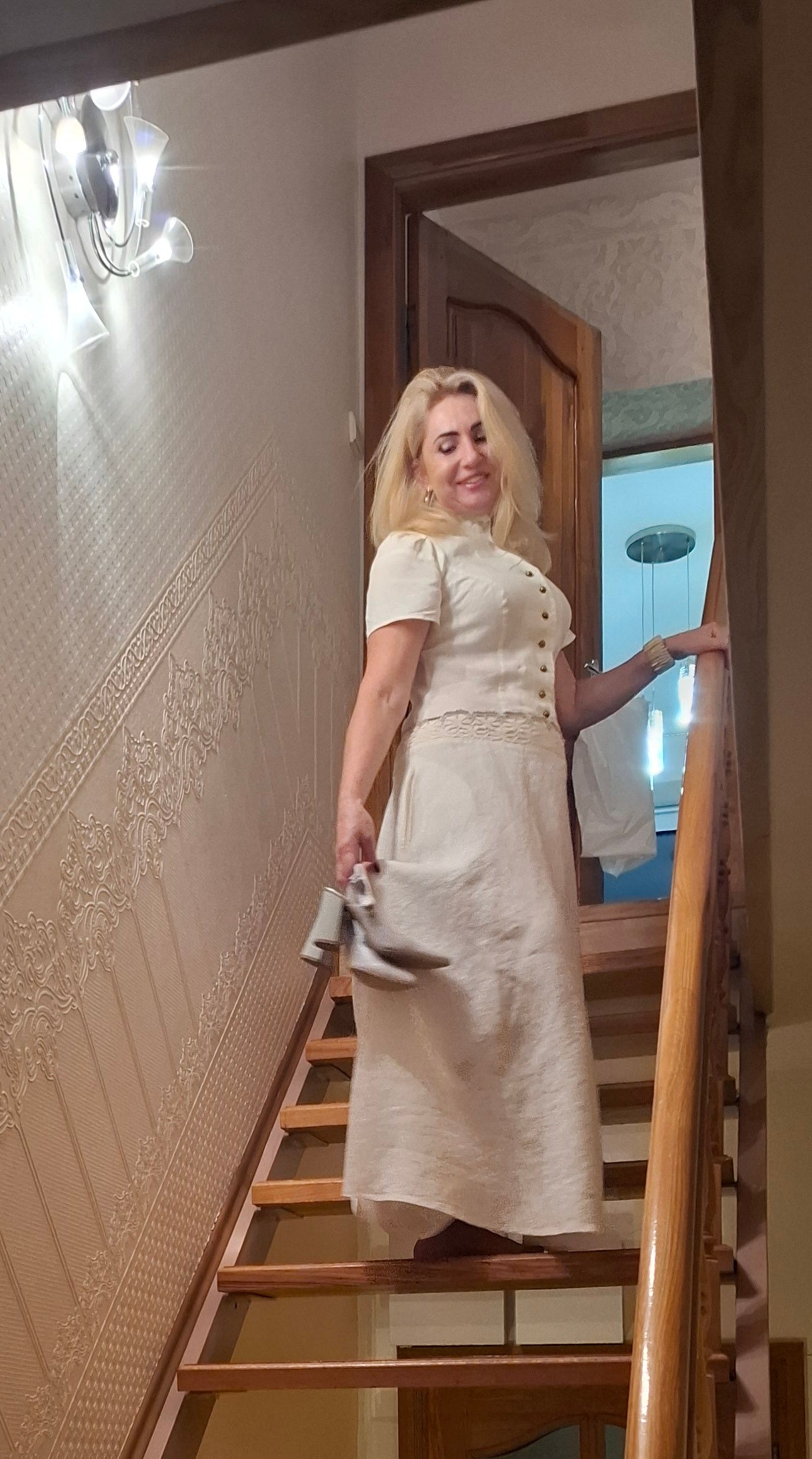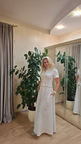 Atraskite eleganciją, natūralumą ir moteriškumą vienoje suknelėje. Ši ilga lininė suknelė pasiūta iš 100 % minkštinto, natūralaus lino, kuris maloniai krenta, leidžia odai kvėpuoti ir suteikia ypatingą komfortą bet kokiai progai.