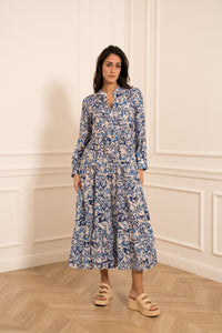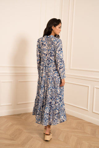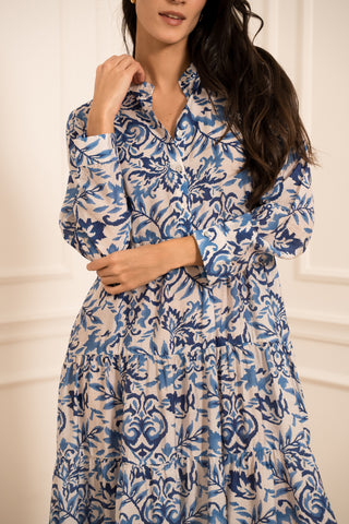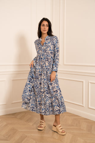 Atraskite elegantišką ir išskirtinę ilgą vasaros suknelę su šviesiu pagrindu ir mėlynu ornamentiniu gėlių raštu. Tai modelis, kuris sujungia lengvumą, prabangos pojūtį ir praktiškumą.