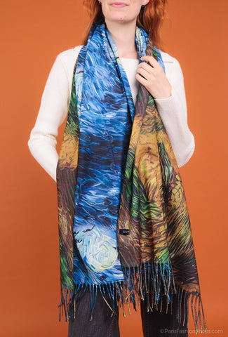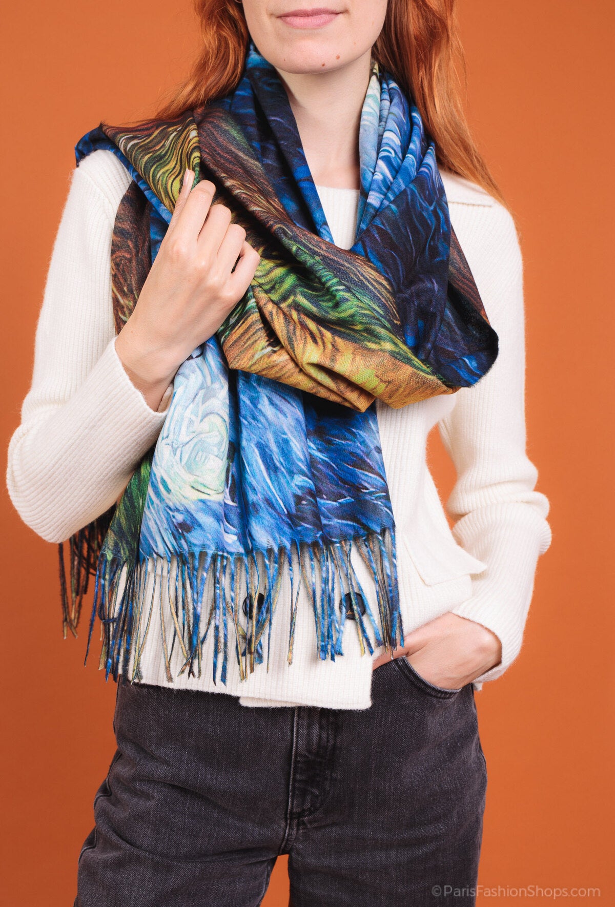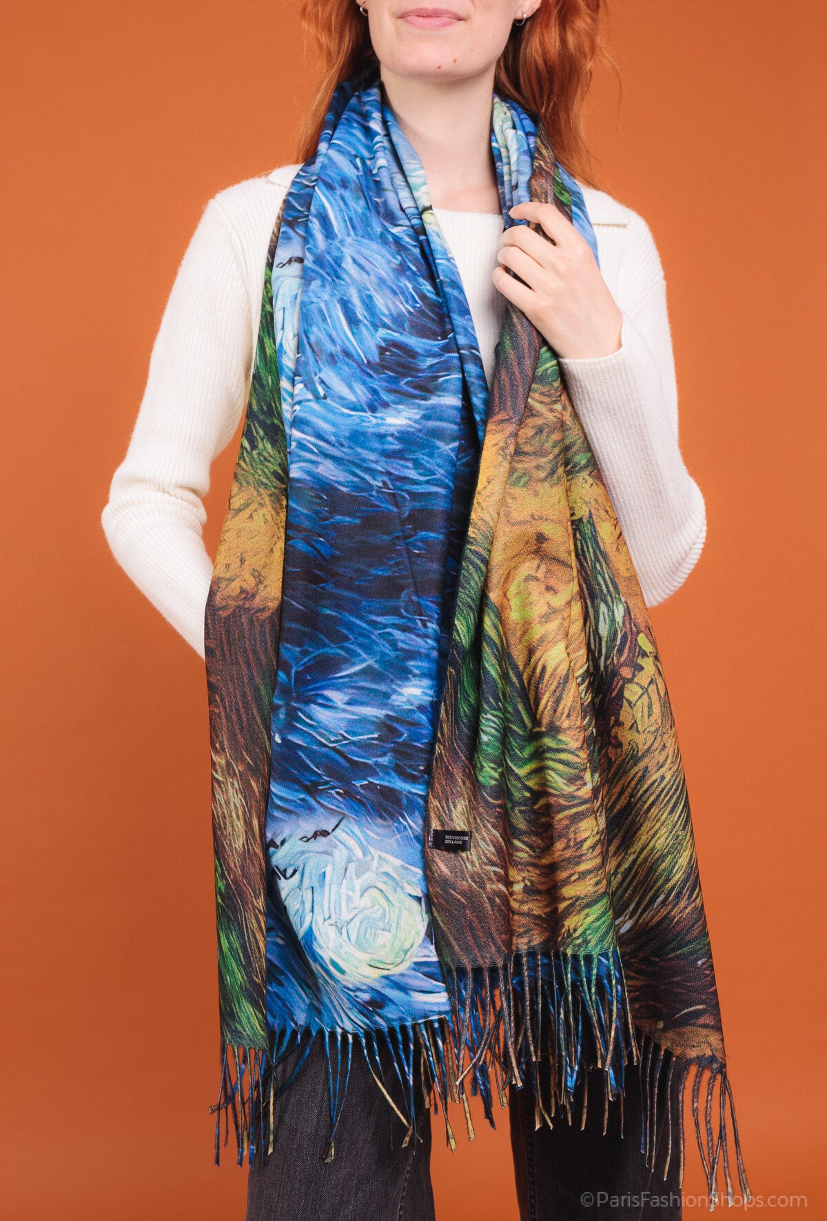 Dvipusis viskozės ir vilnos šalikas su mėlynais ir rusvais raštais – universalus ir šiltas aksesuaras