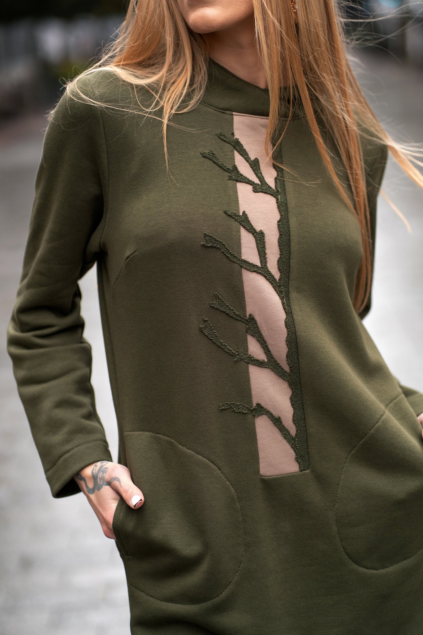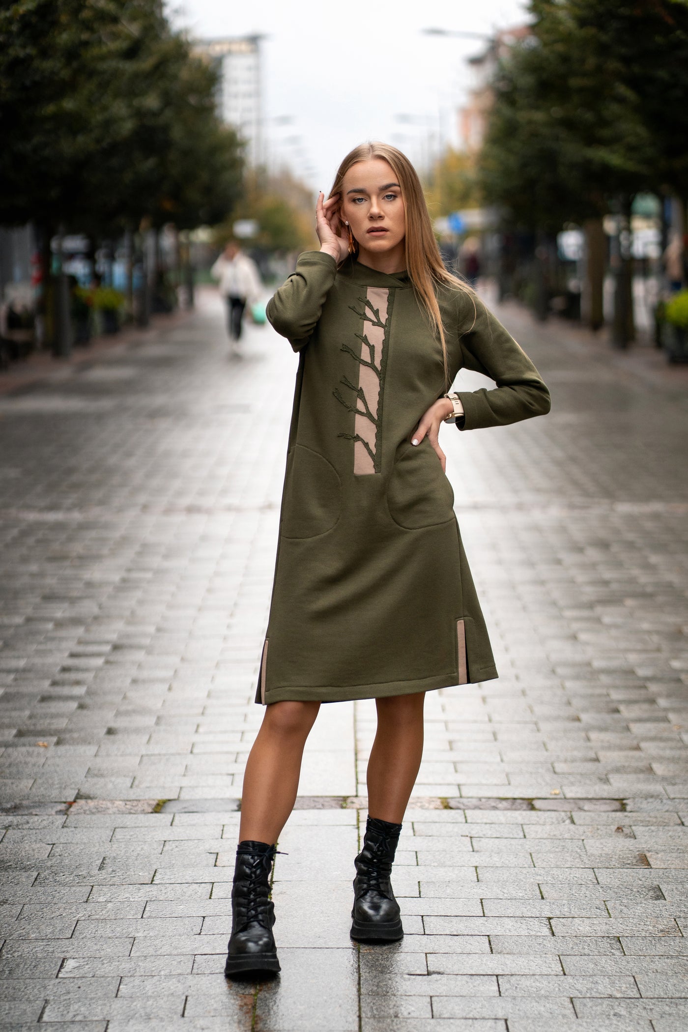 Samaninės spalvos trikotažinė suknelė su kišenėmis ir rankų darbo dekoru – patogi, šilta ir stilinga - 36 / Samaninė