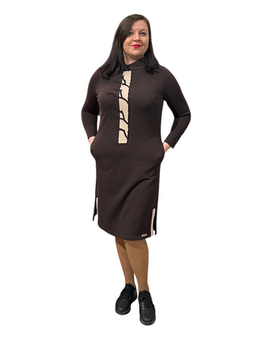Samaninės spalvos trikotažinė suknelė su kišenėmis ir rankų darbo dekoru – patogi, šilta ir stilinga Išpardavimas