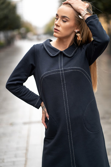 Elegantiška trikotažinė suknelė su apykakle ir priekiniu skeltuku – tamsiai mėlyna, tamsiai žalia, kapučino, bordo, raudona - 36 / tamsiai mėlynas