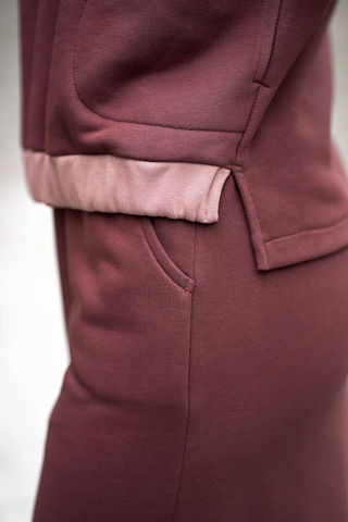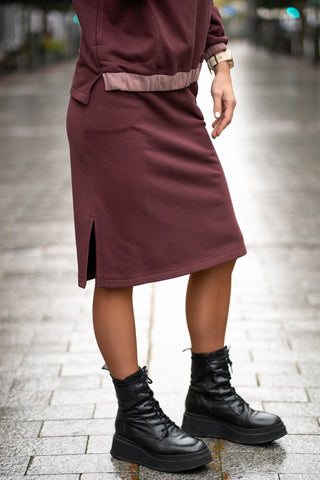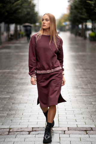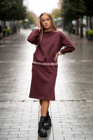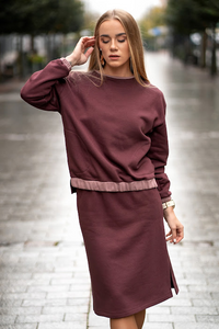 Trikotažinis kostiumėlis su sijonu ir nuleistais pečiais - 36 / bordo