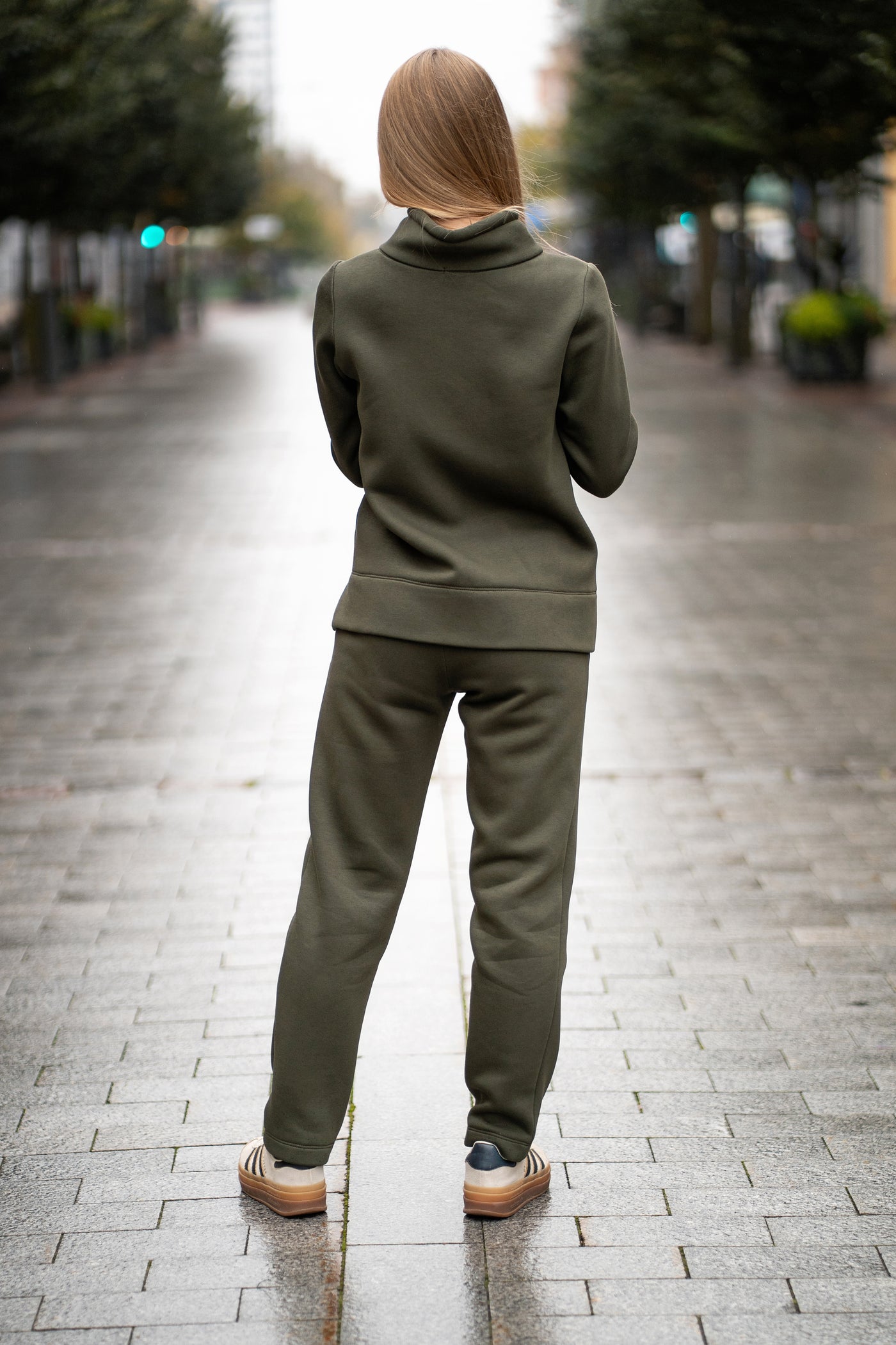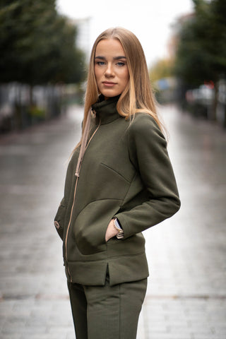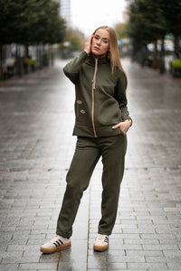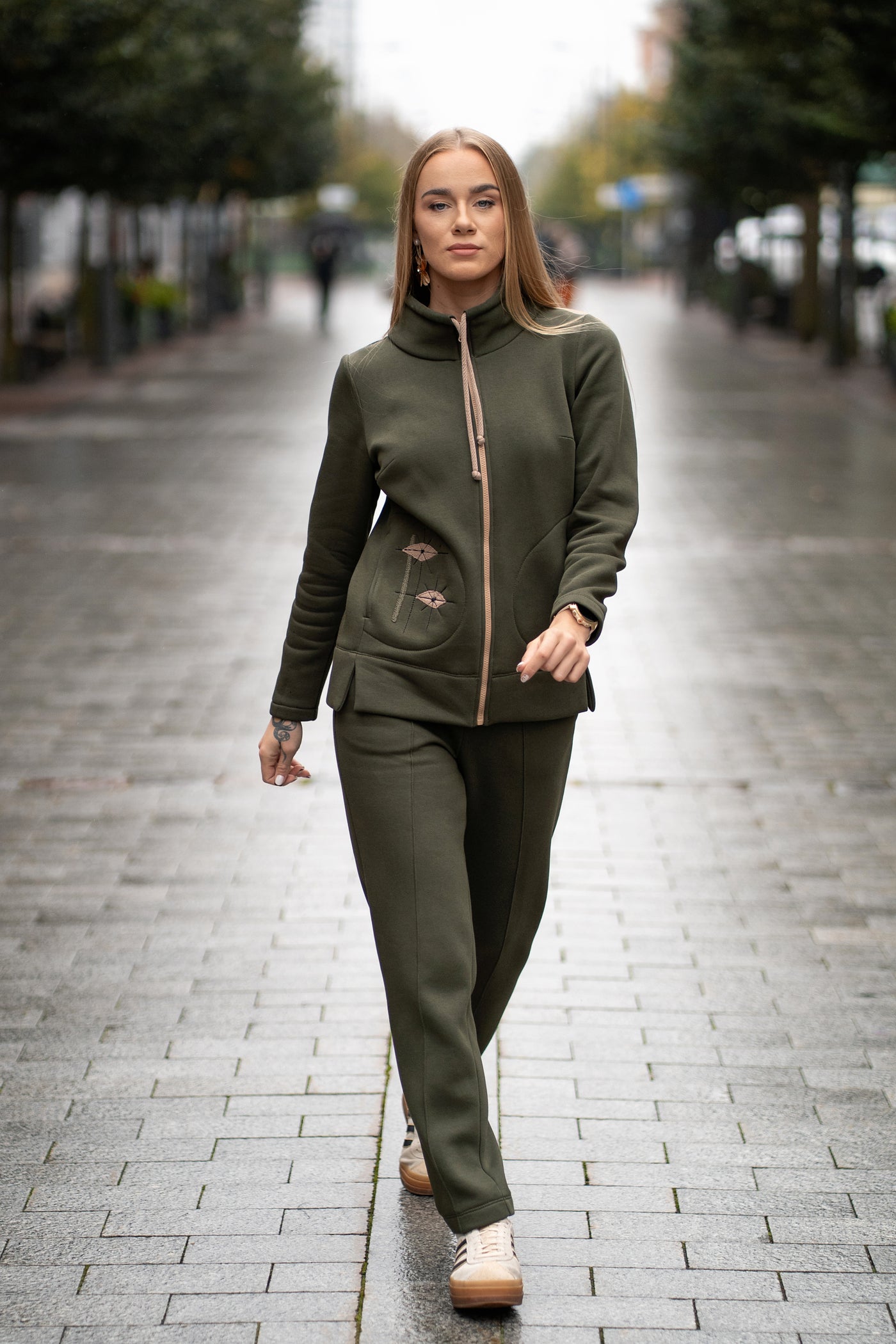 Šis moteriškas laisvalaikio trikotažinis kostiumėlis sukurtas kasdieniam patogumui ir švariam, tvarkingam siluetui. Vidinė audinio pusė su švelniu pūkeliu, todėl jauku ir malonu kūnui. Džemperis turi užtrauktuką, patogias kišenes, šonuose – maži skeltukai, o priekyje matomas rankų darbo dekoras, kuris suteikia išskirtinumo. Audinys – aukštos kokybės trikotažas (95 % medvilnė, 5 % elastanas): minkštas, elastingas, viršus nesiburbuliuoja ir gražiai laiko formą.