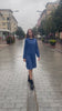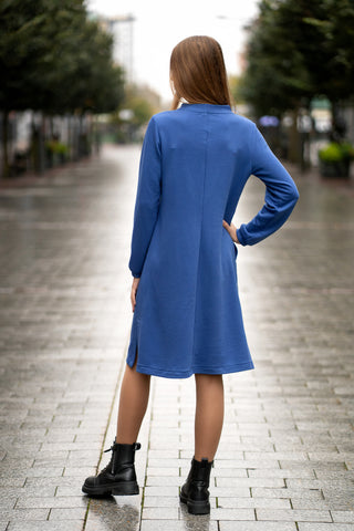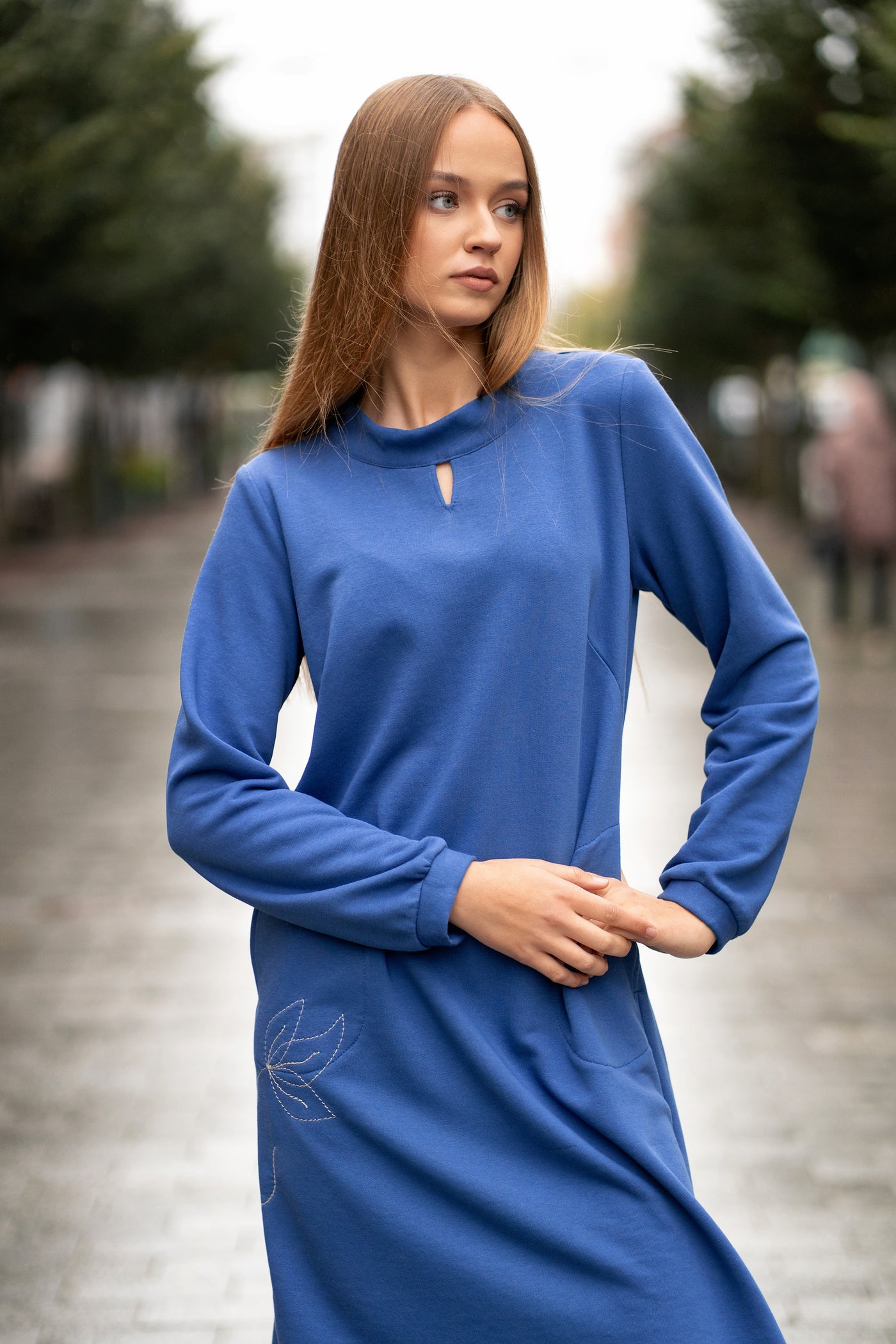 Mėlyna trikotažinė suknelė su stilizuota gėle ir skeltuku Išpardavimas