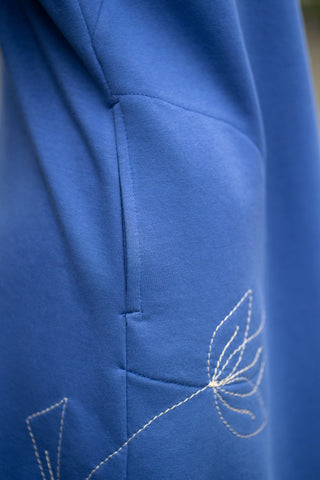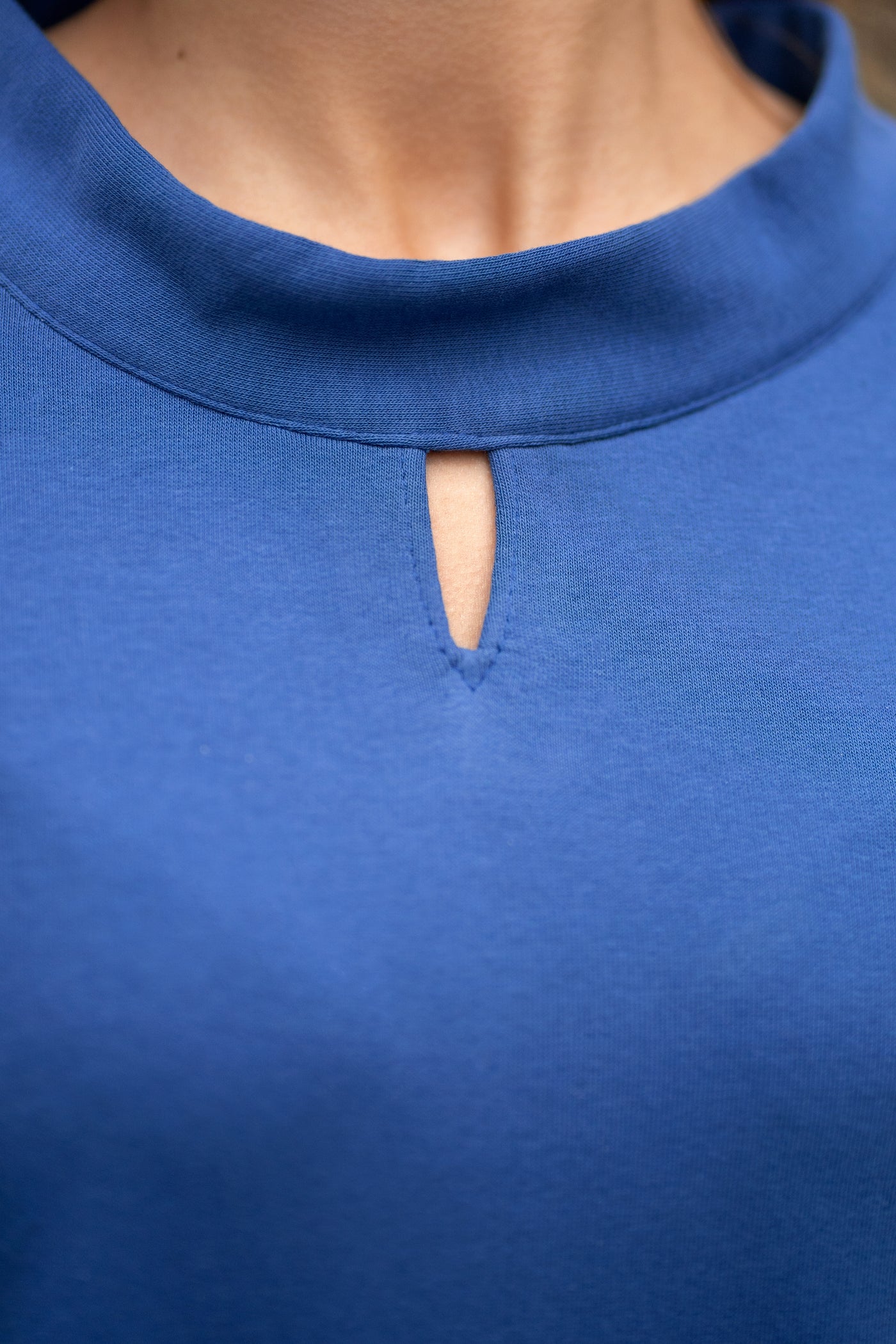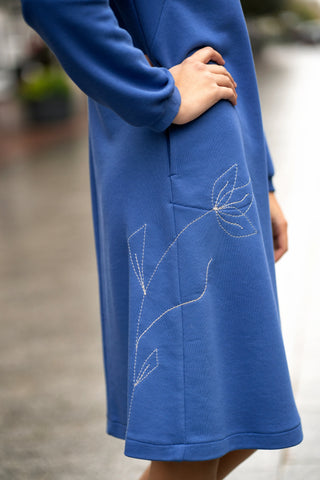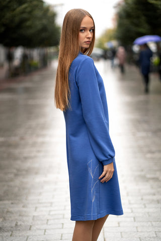 Mėlyna trikotažinė suknelė su stilizuota gėle ir skeltuku - 36 / Mėlyna