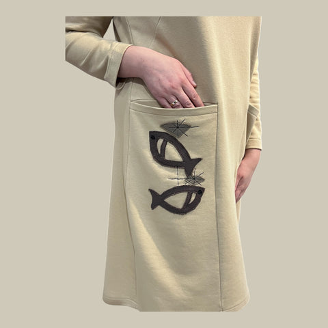 Trikotažinė suknelė su kišene ir rankų darbo dekoru – dydžiai 36–52 - 36 / Smėlinė