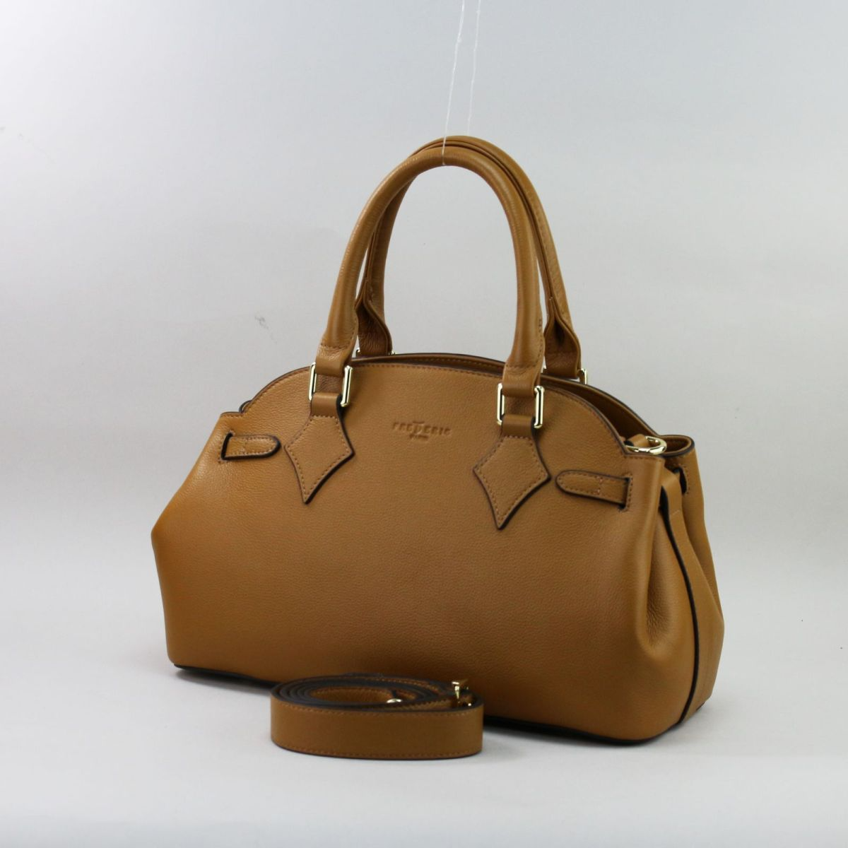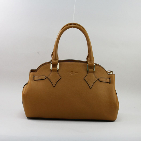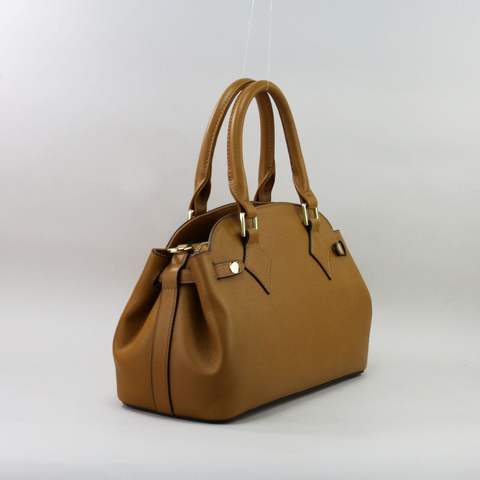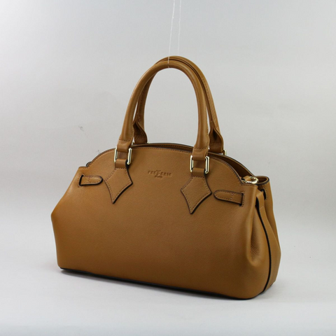 Camel spalva – šilta, natūrali ir lengvai derinama tiek vasaros, tiek žiemos garderobe. Rankinė pasiūta iš aukštos kokybės natūralios odos, kuri maloni liesti, išlaiko formą ir ilgai dėvisi. Galima nešti už dviejų trumpų rankenų arba ant peties su ilga, šiek tiek platesne, nusegama ir reguliuojama rankena. Aukso spalvos furnitūra suteikia elegantišką akcentą, o metalinės kojelės apačioje apsaugo rankinę nuo sąlyčio su žeme.
